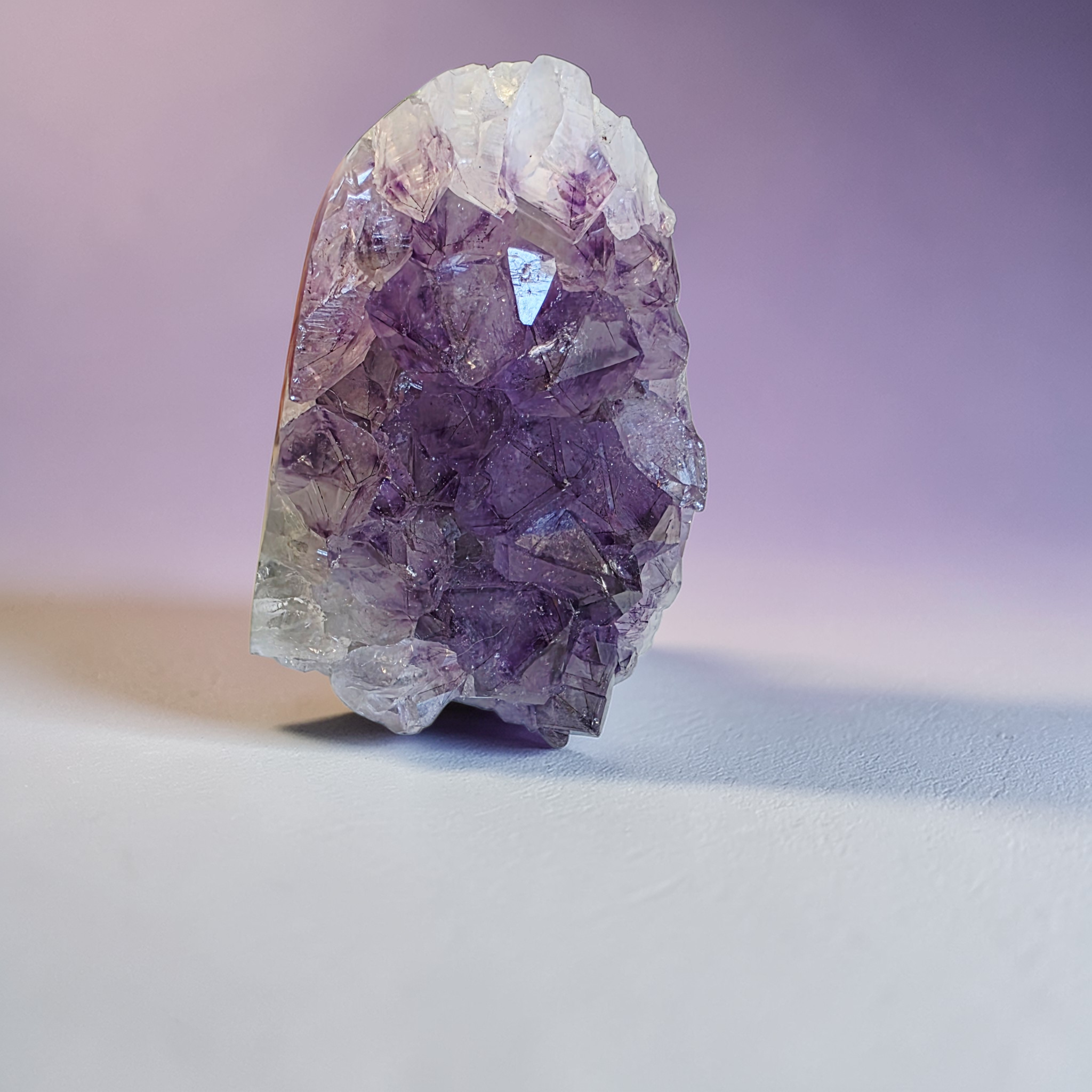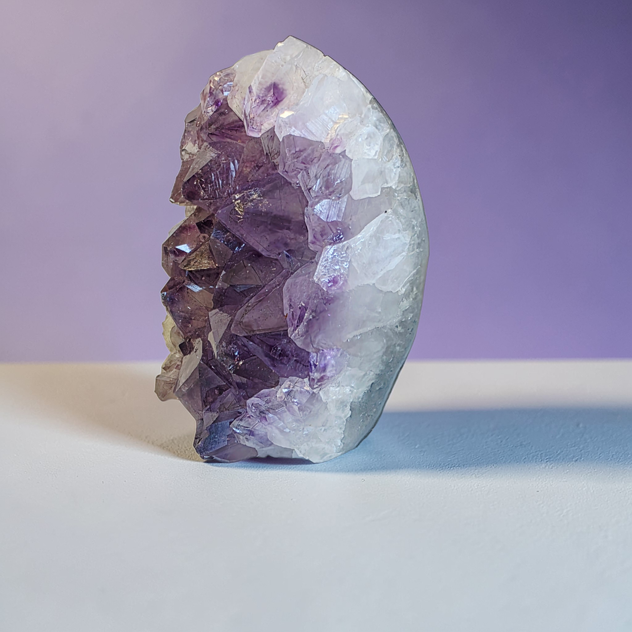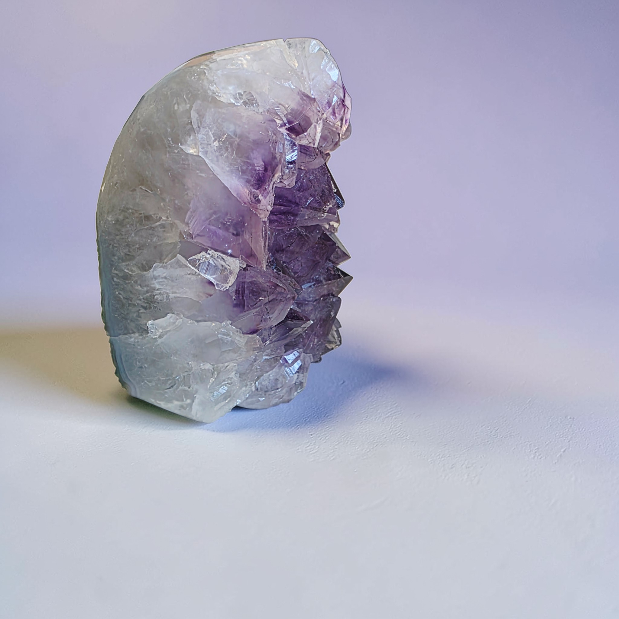 Quality Brazilian Amethyst Large point, upright cluster that features a breathtaking amount of quartz developed behind its purple teeth ? Polished and rounded outer edges with minimal raw rock behind. Majority of weight is high quality Amethyst to Calm your mind and soothe the soul into a more relaxed state - lets be real - your not coping or sleeping - so pick yourself up, buy Amethyst, focus on being relaxed for a short while and proceed at life once more ?❤️
