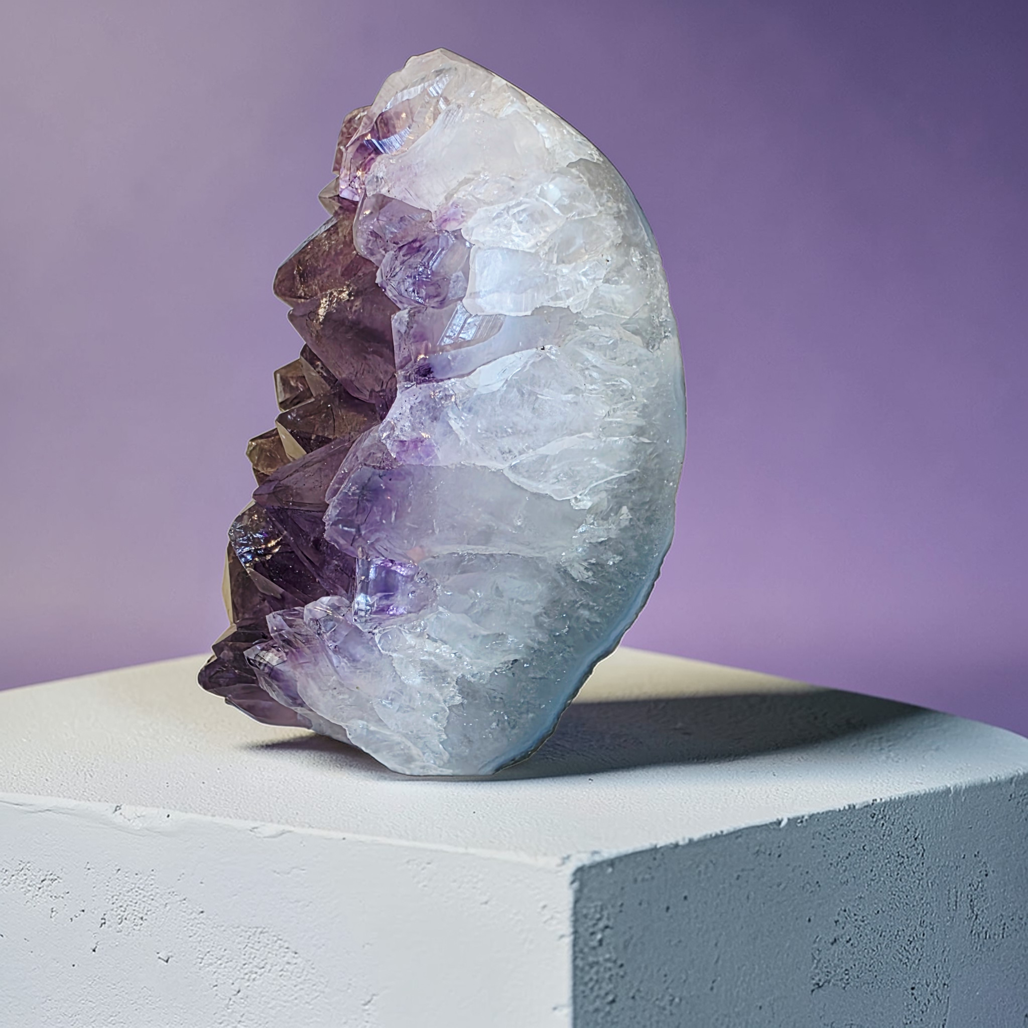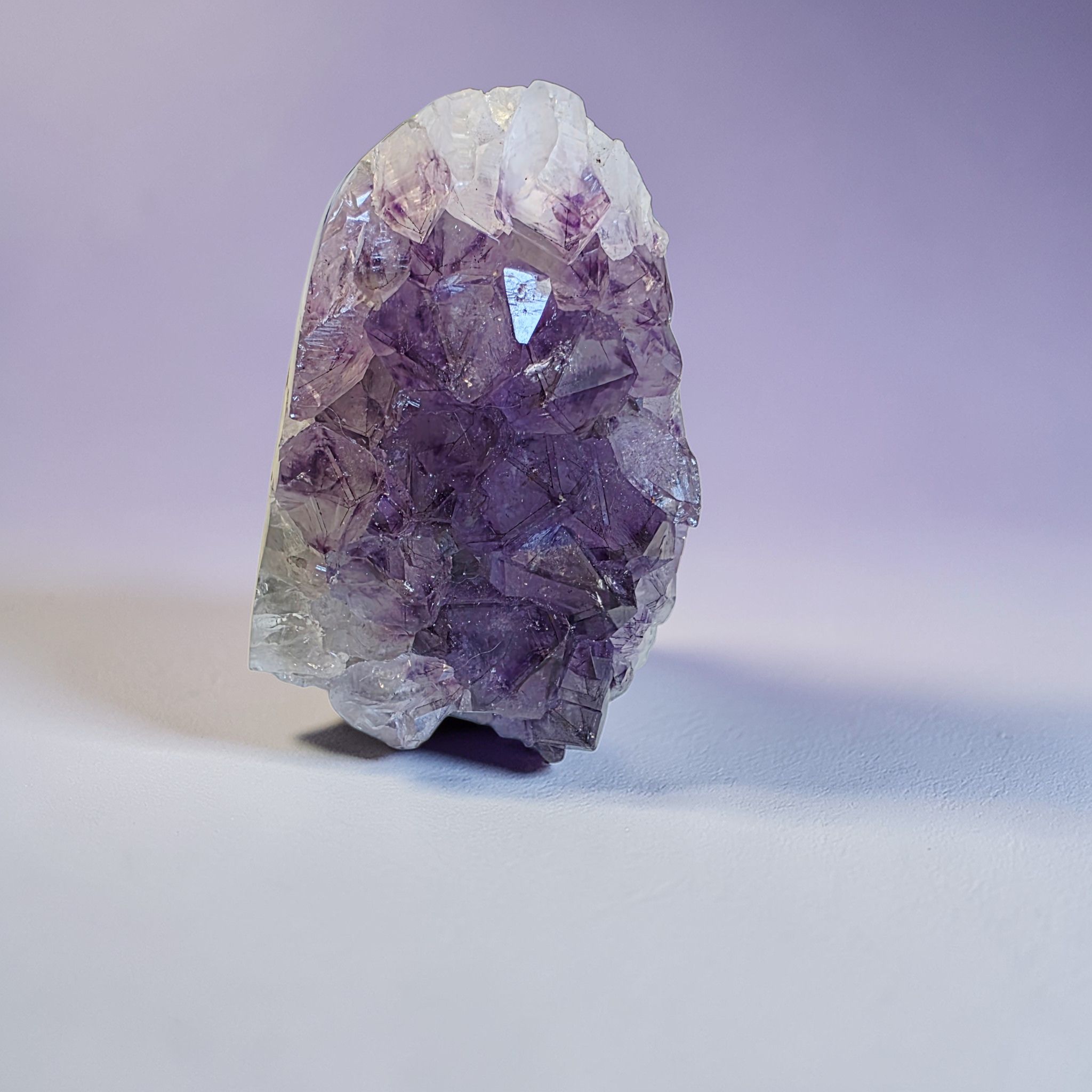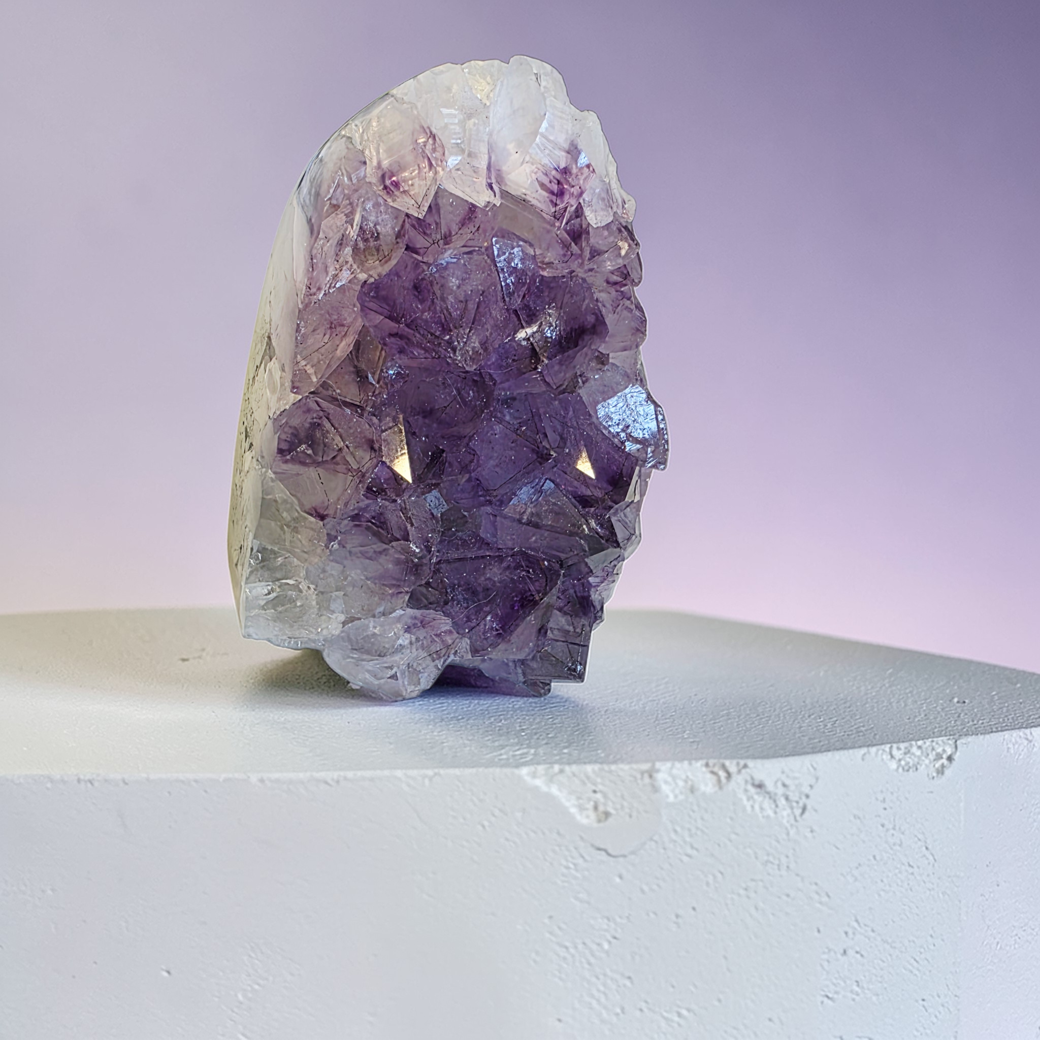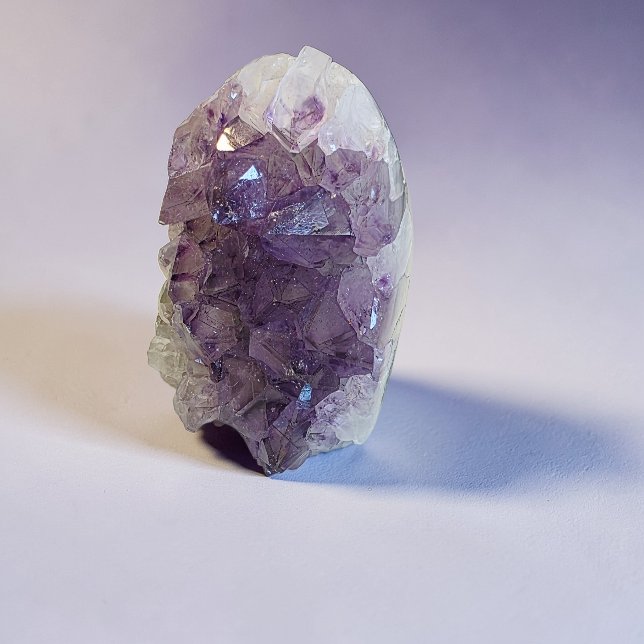 Quality Brazilian Amethyst Large point, upright cluster that features a breathtaking amount of quartz developed behind its purple teeth ? Polished and rounded outer edges with minimal raw rock behind. Majority of weight is high quality Amethyst to Calm your mind and soothe the soul into a more relaxed state - lets be real - your not coping or sleeping - so pick yourself up, buy Amethyst, focus on being relaxed for a short while and proceed at life once more ?❤️