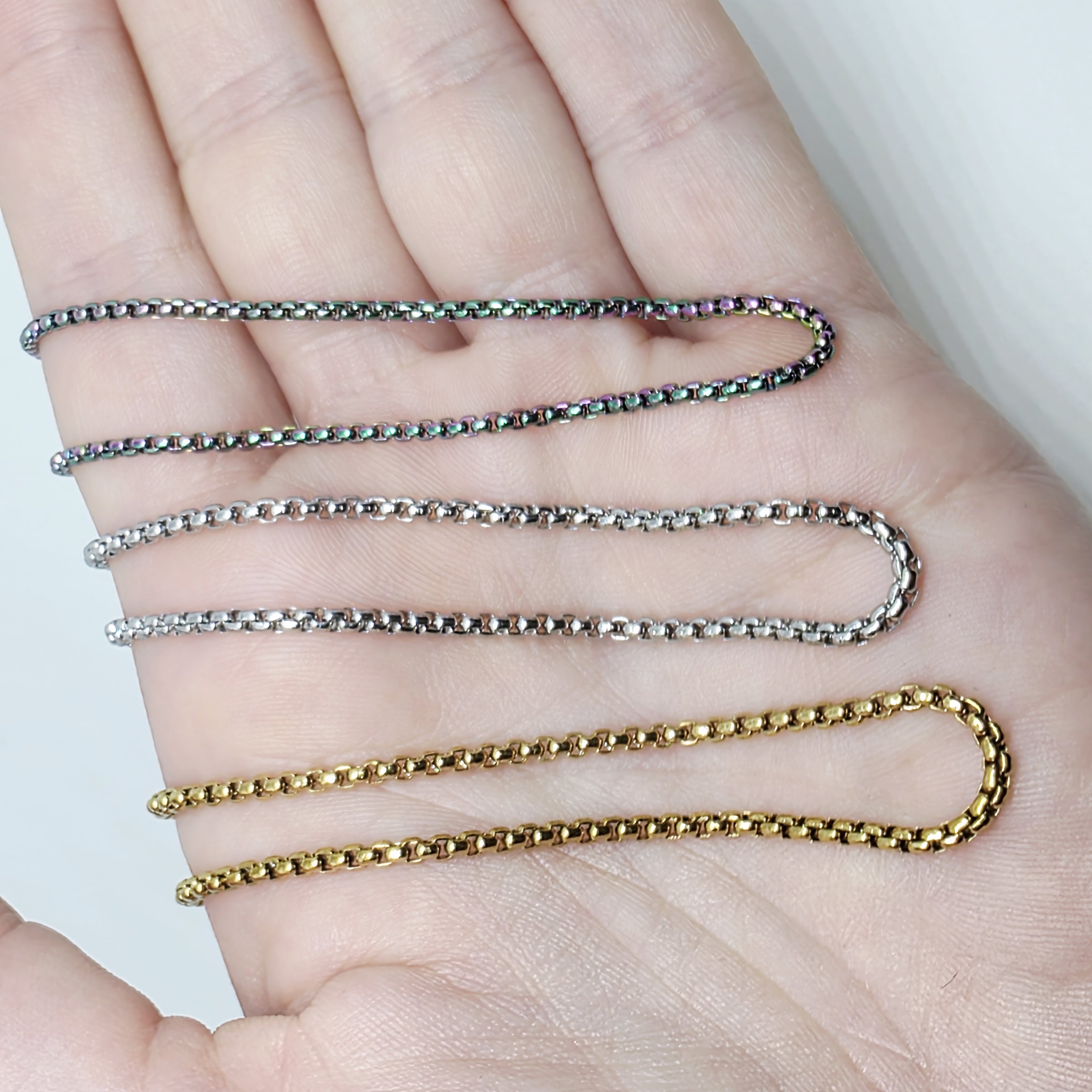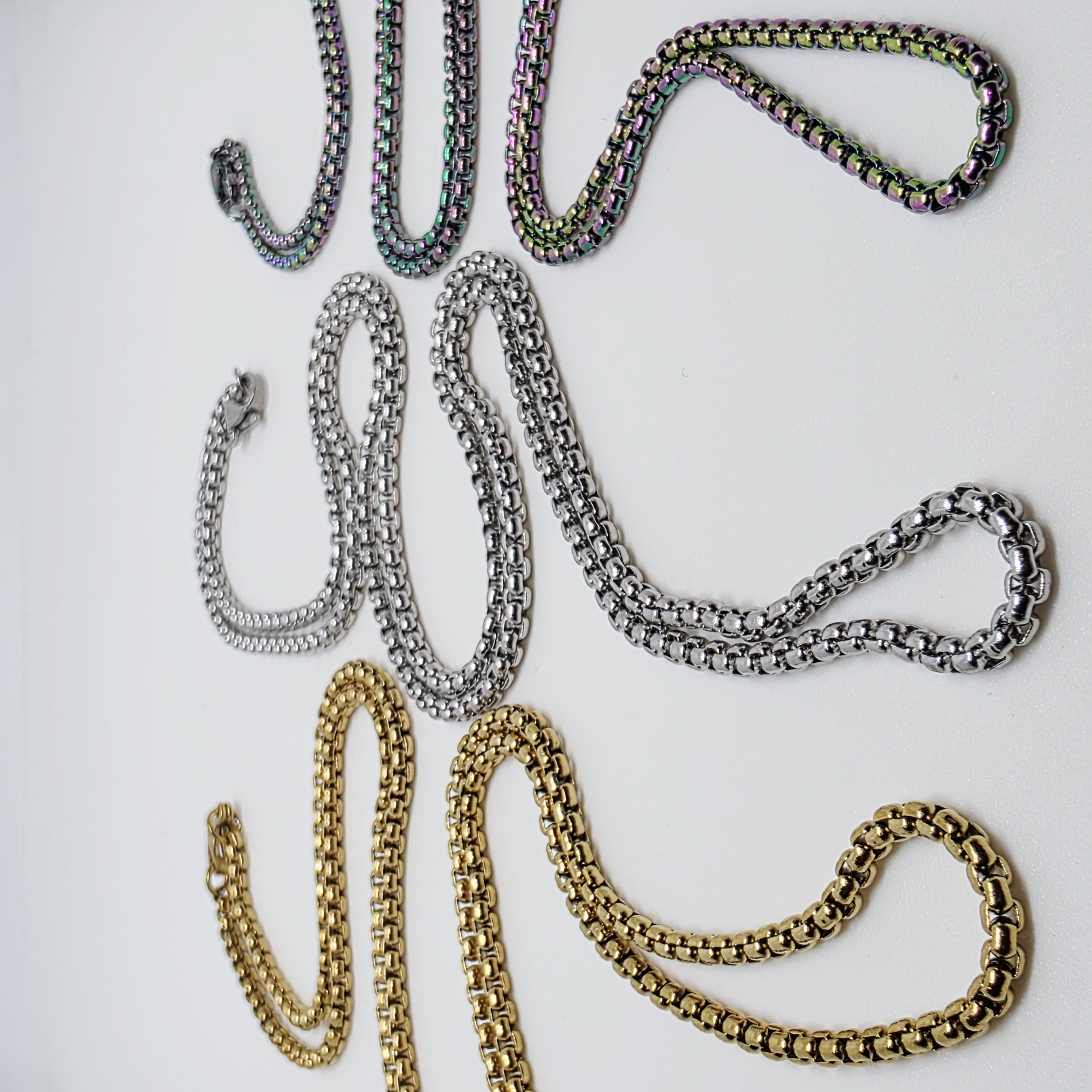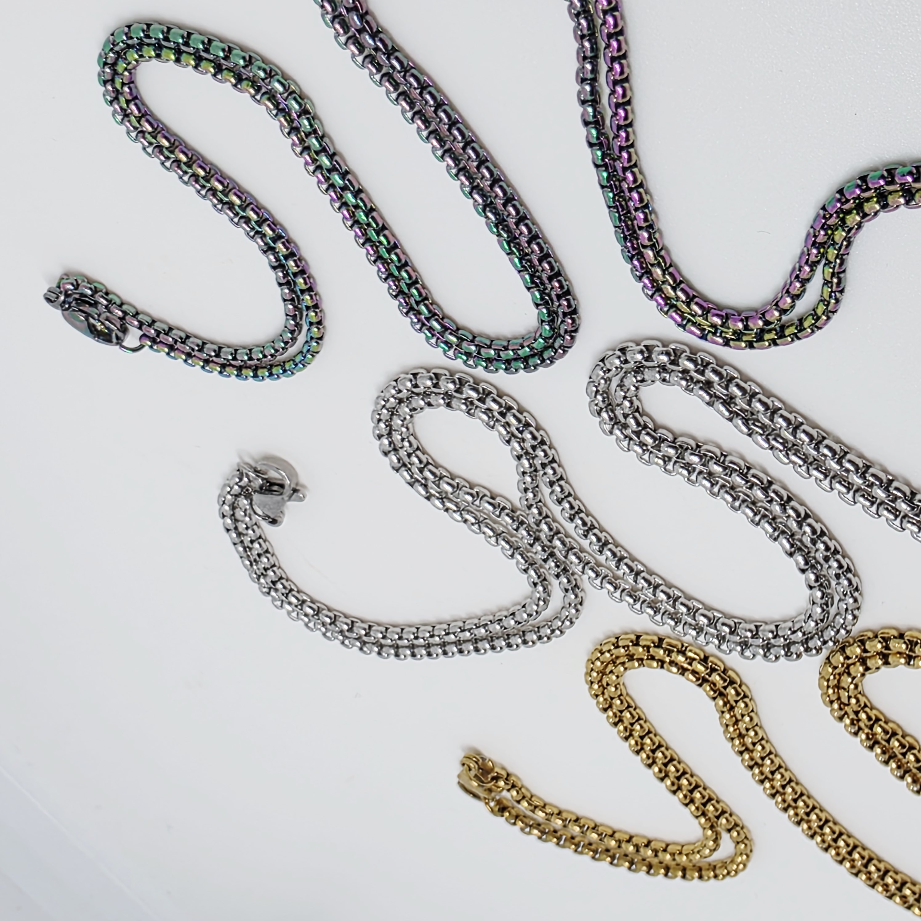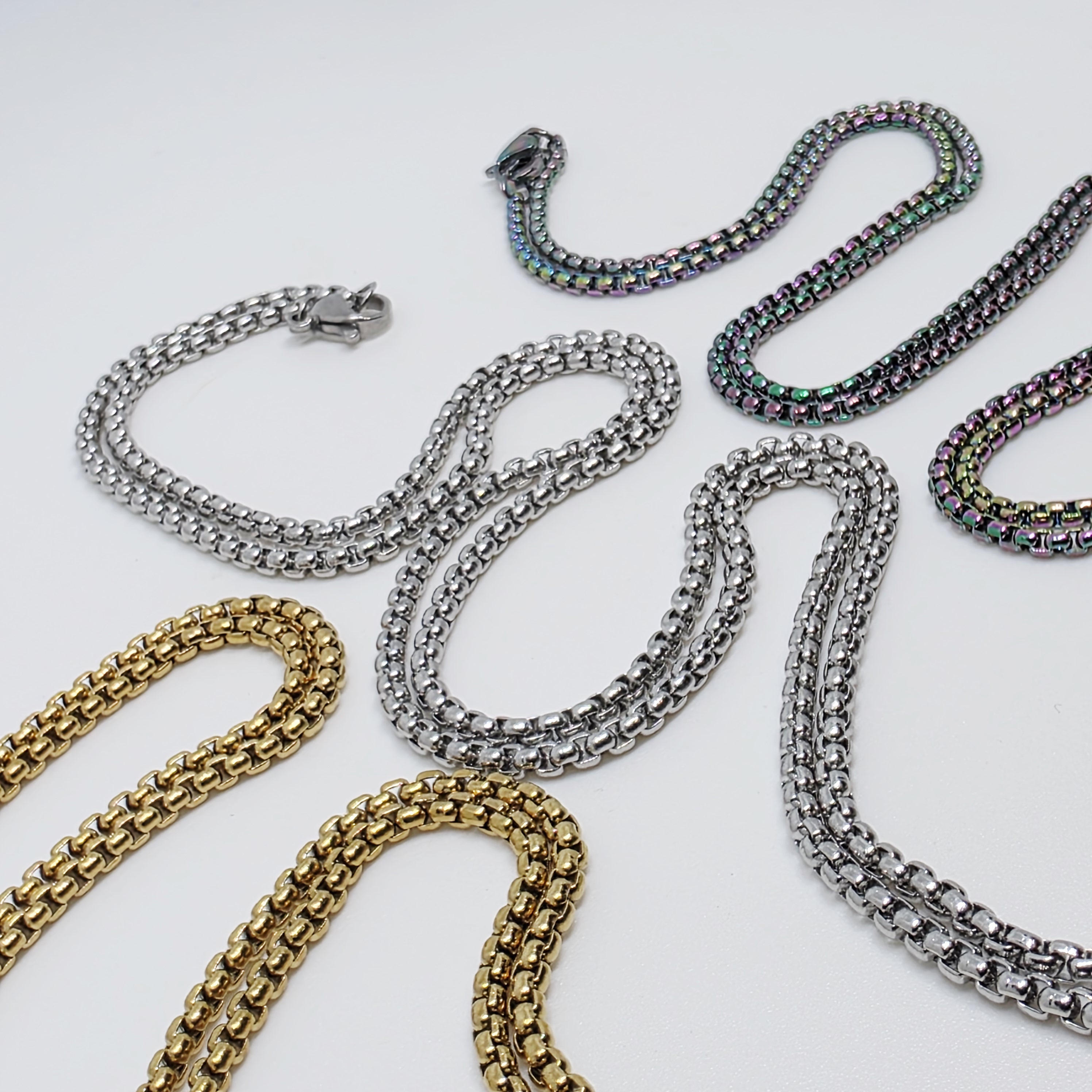 Sleek Box Chains move comfortably over the skin. Available in gold, silver, rainbow. 70cm in length, enough to slip over most heads. Lobster clasp to fasten.