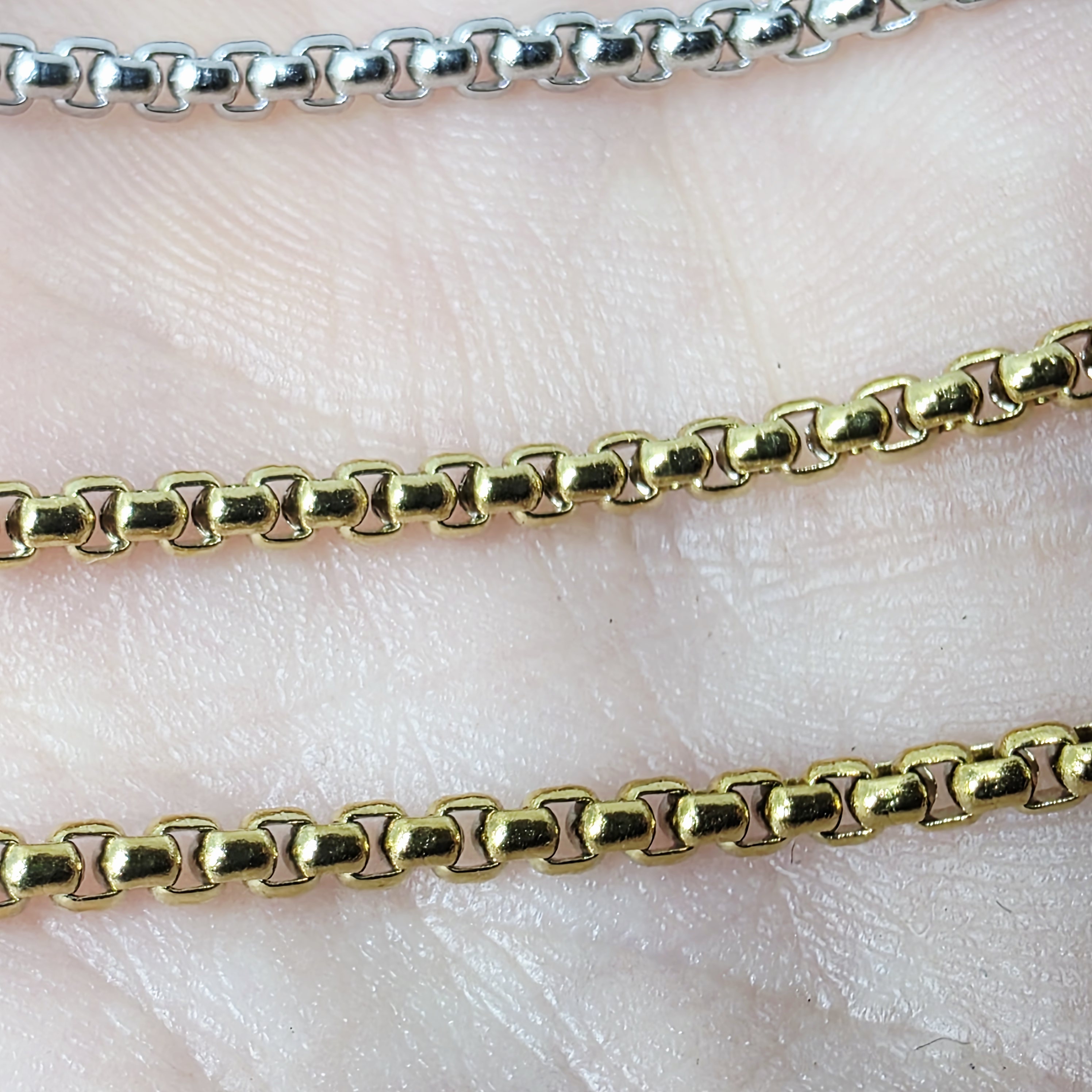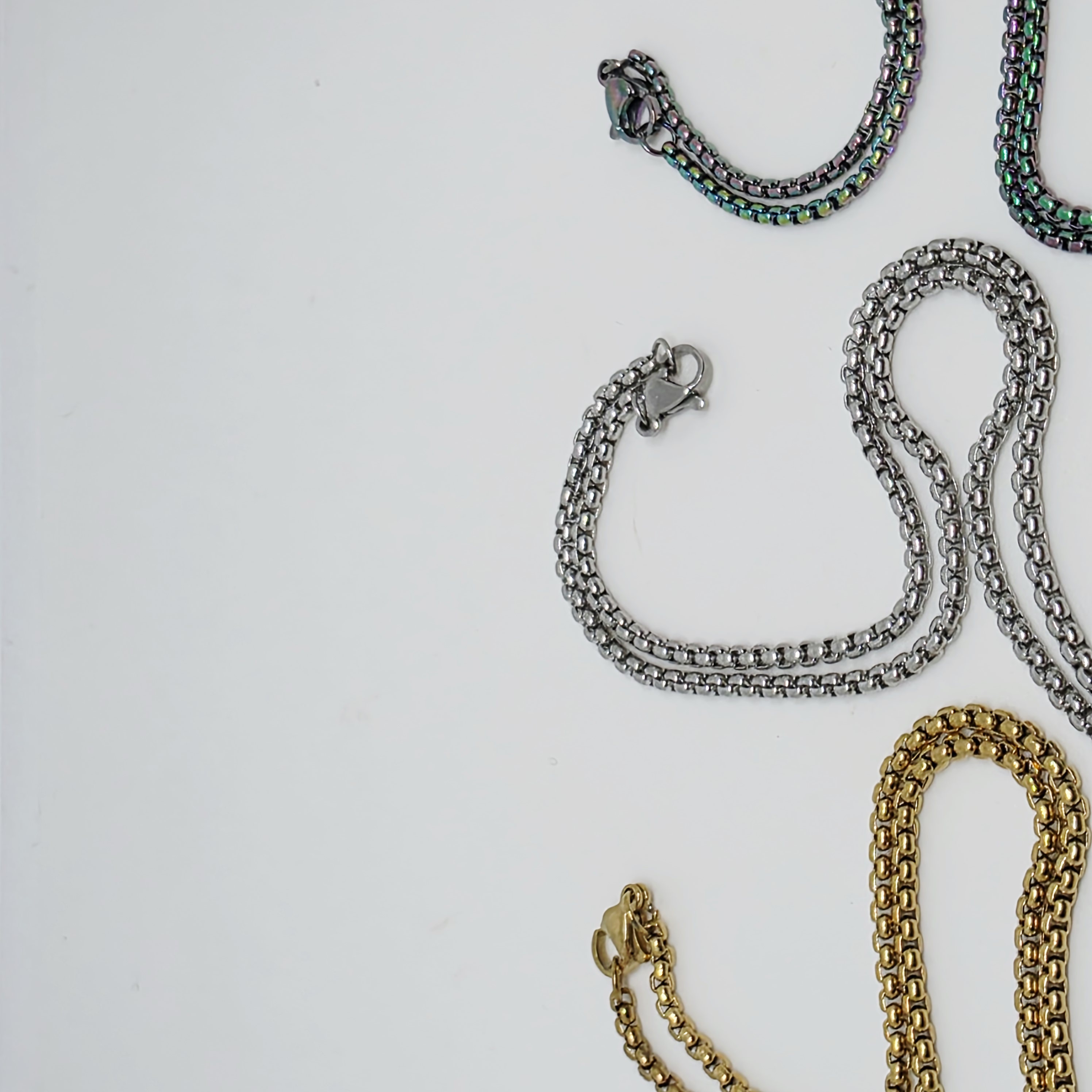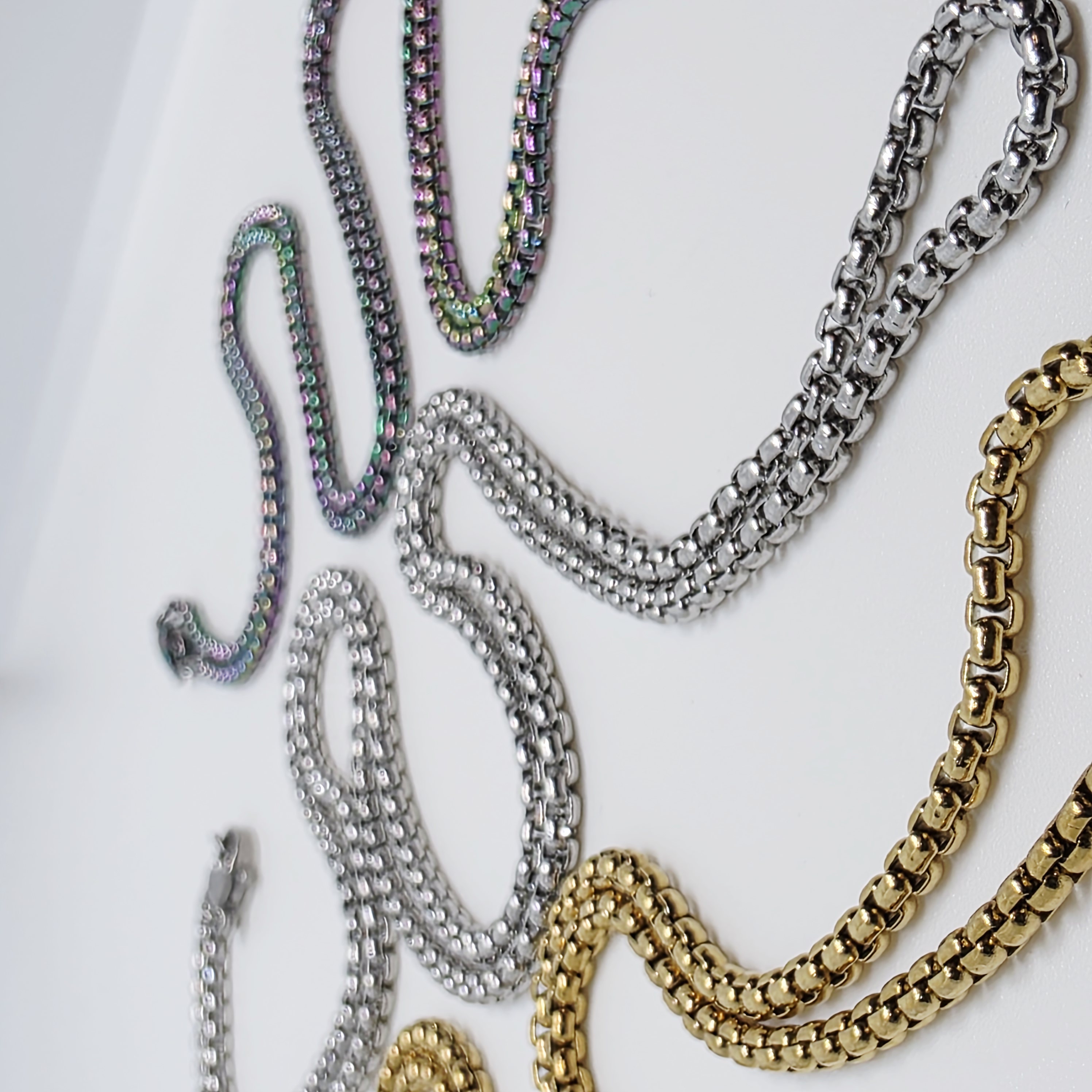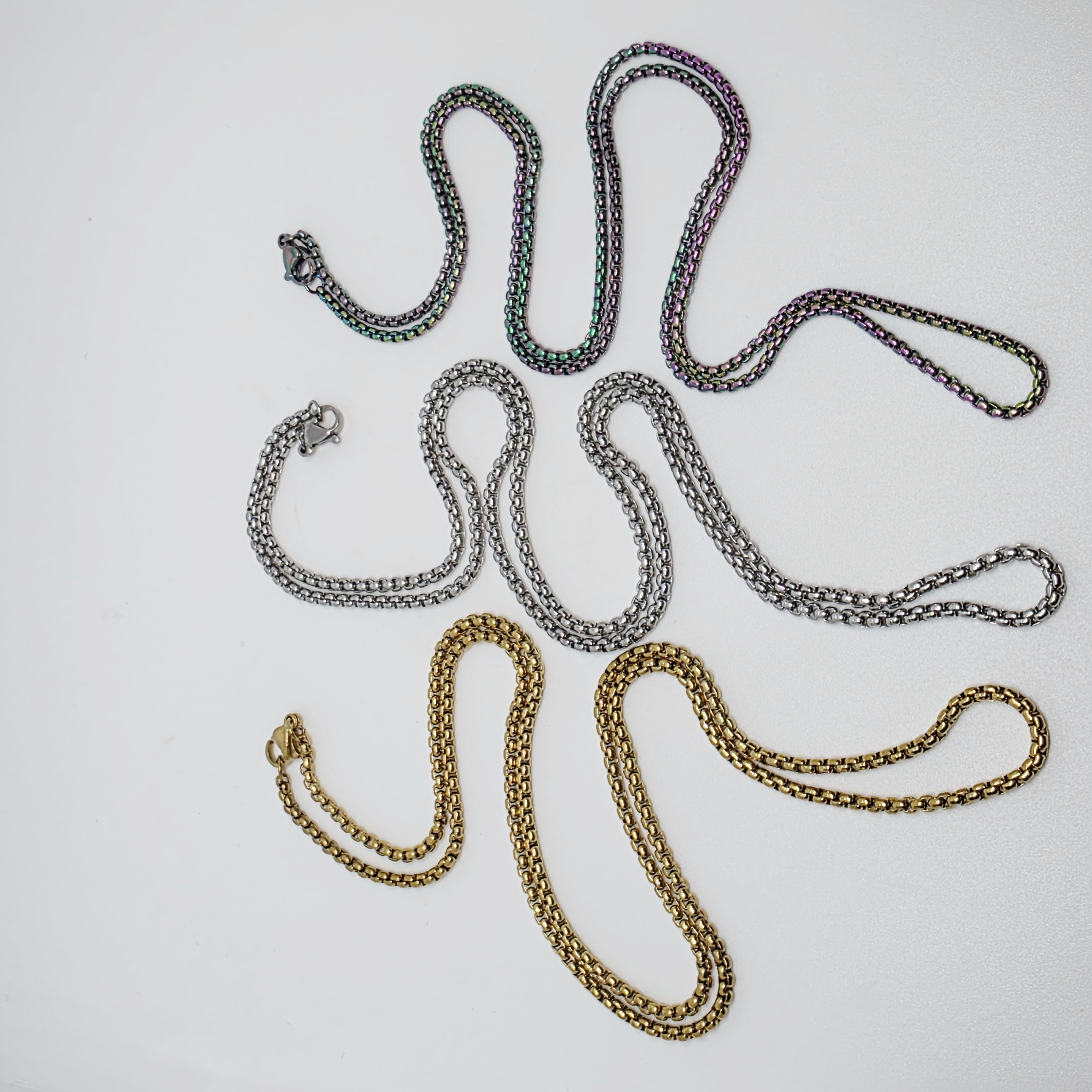 Sleek Box Chains move comfortably over the skin. Available in gold, silver, rainbow. 70cm in length, enough to slip over most heads. Lobster clasp to fasten.