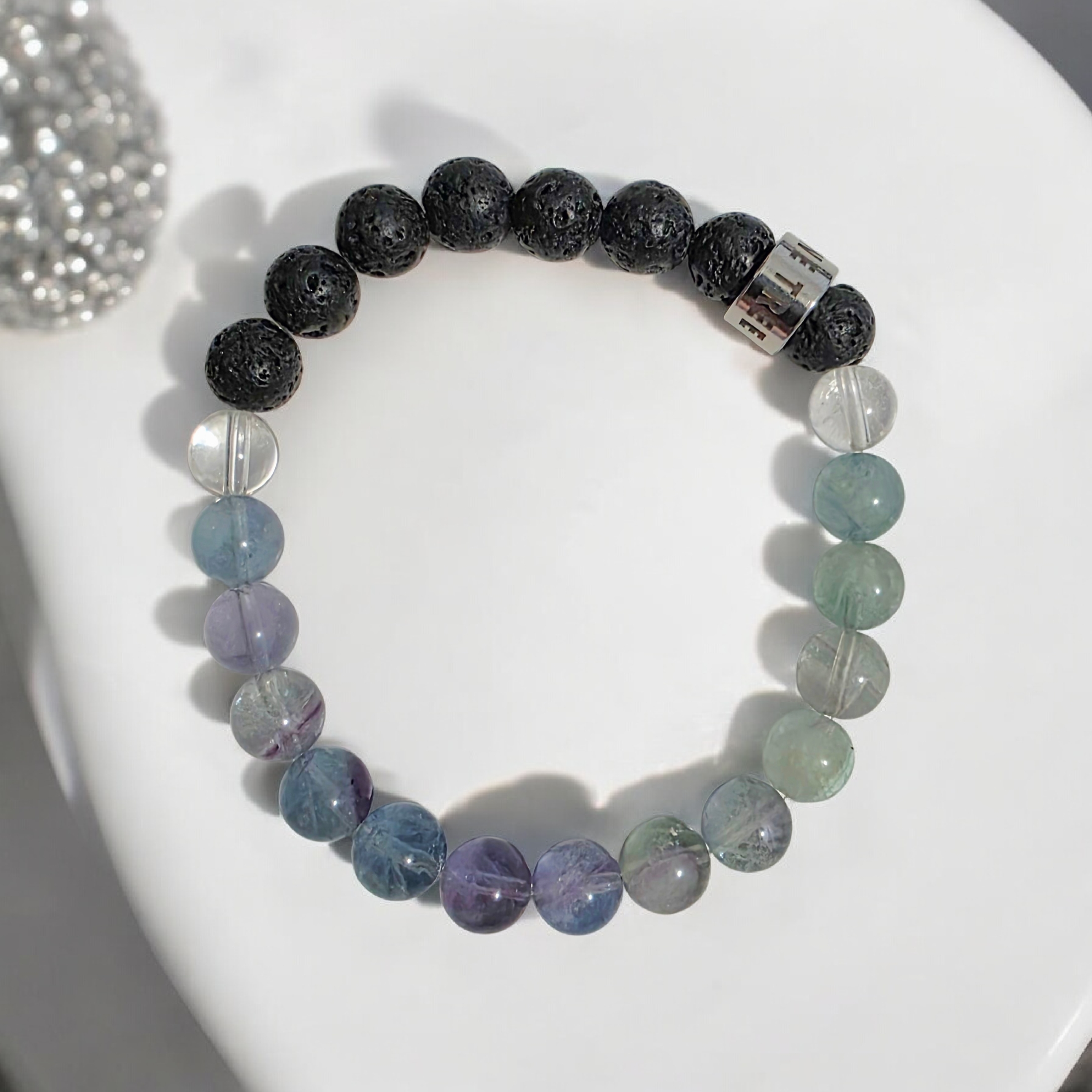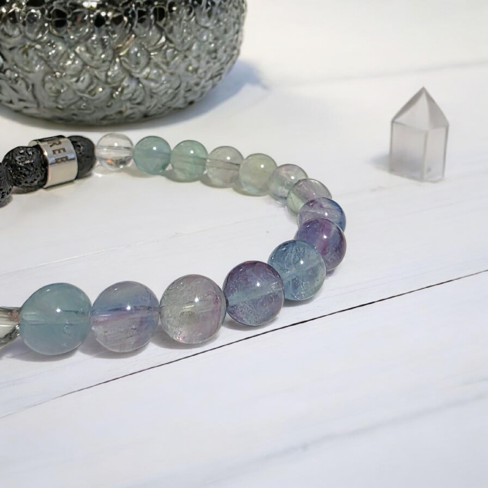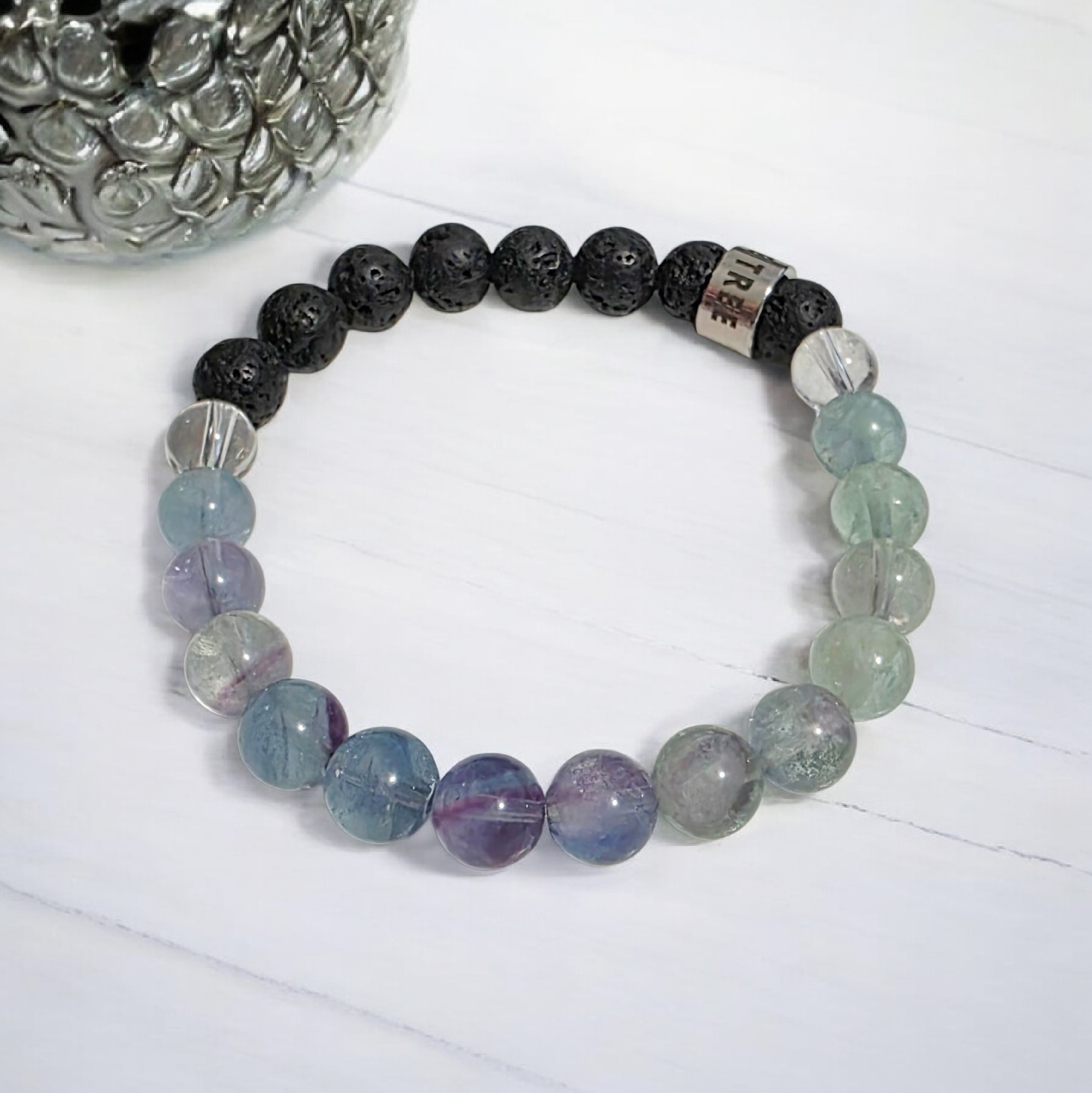Fluorite is called the aura cleansing and stabilisation stone. Known to absorb and neutralises negative stress energies to increase concentration and focus as well as optimism, positivity and self-confidence. Fluorite's energy may bring together the mind and body for inner balance. Cleanse and set your intentions before you wear, see Care Instructions tab. Fluorites properties align with the Throat and Third Eye Chakras. Fluorite's properties compliment the personality traits of Zodiac Pisces and Capricorn. Combine this bracelet with our Eucalyptus Oil Roller with Clear Quartz Shaker Gemstones. Roll onto black volcanic rock beads for aromatherapy benefits of your hand made bracelet.