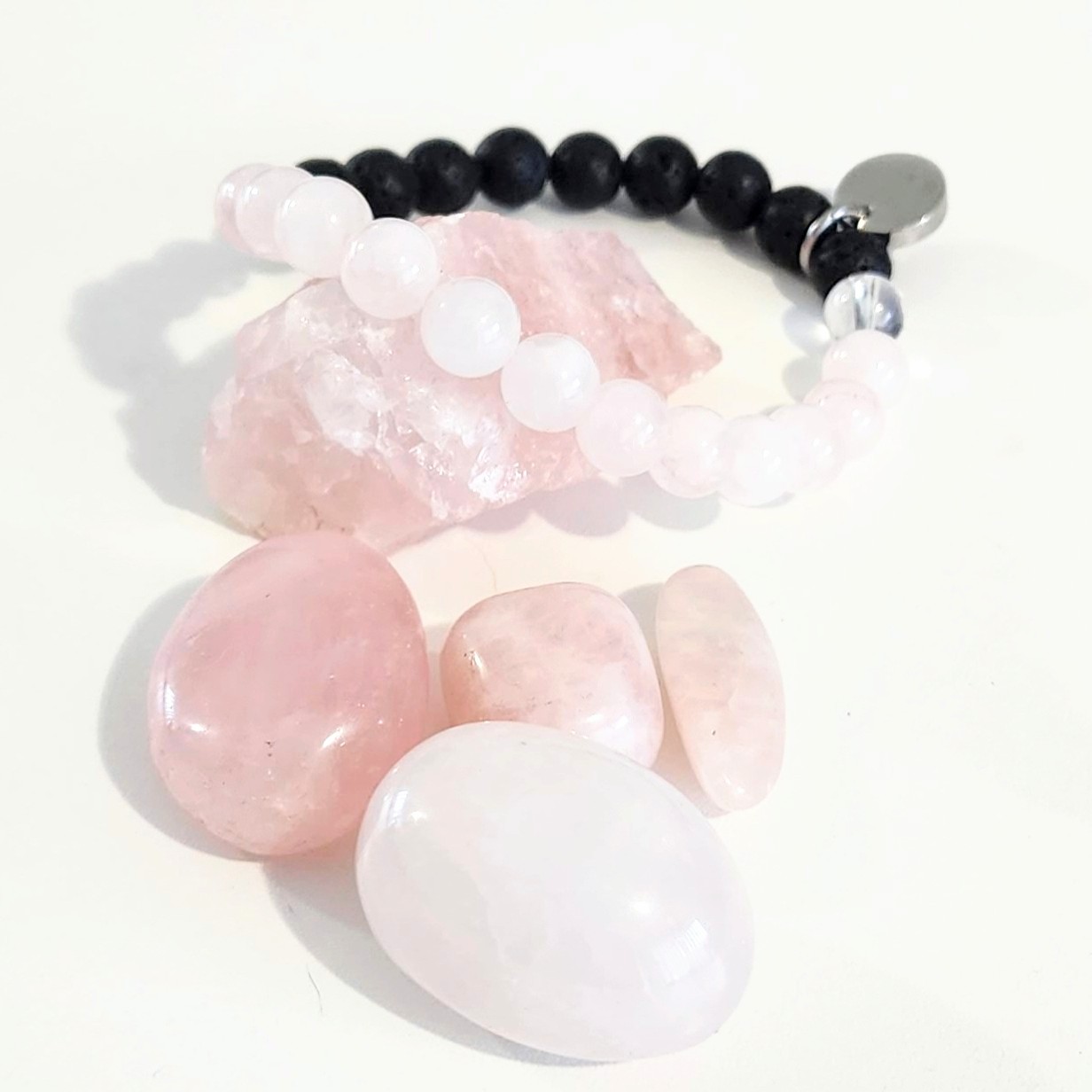 Our Rose Quartz Aromatherapy Bracelet comprises of the ultimate stone of unconditional love. a popular and easily accessible crystal for learning to accept and love yourself fully and also for showing kindness and love to others. Giving you positive energetic vibrations to relieve stress and bring calm, peace and hope to your life. In this sense this bracelet can be helpful in fighting the negative struggles associated with depression. Including post-natal depression help. Rose Quartz energies will encourage you to overcome any emotional abuse you may have been subject to, as well as helping you process any mistakes, take them on board and forgive yourself for the learning you have miss-labelled as a mistake. Zodiac: Taurus Chakra: Heart  Oil Roller: "Love" 3% Rose Oil with Rose Quartz
